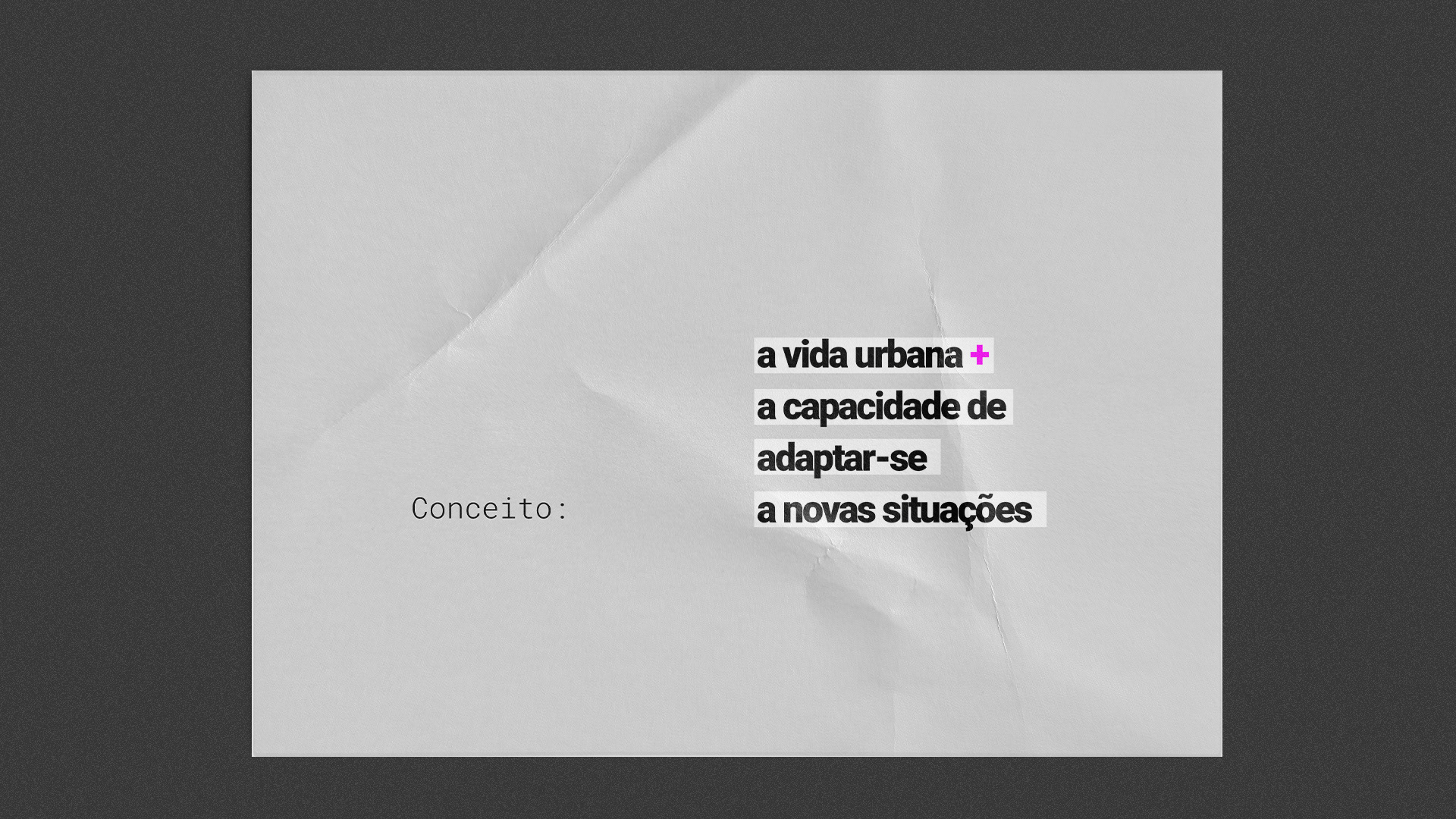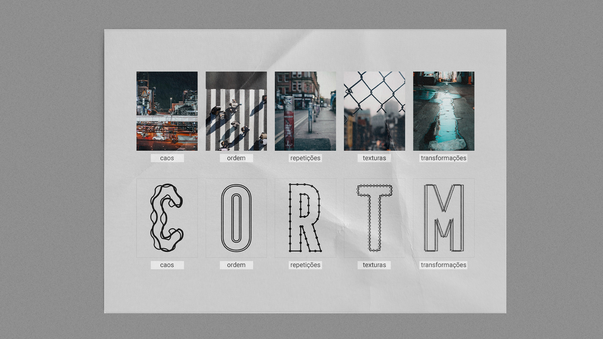 The typographic aesthetic was crafted using elements that mirror the urban scenario, characterized by chaos, order, repetition, textures, and transformation.